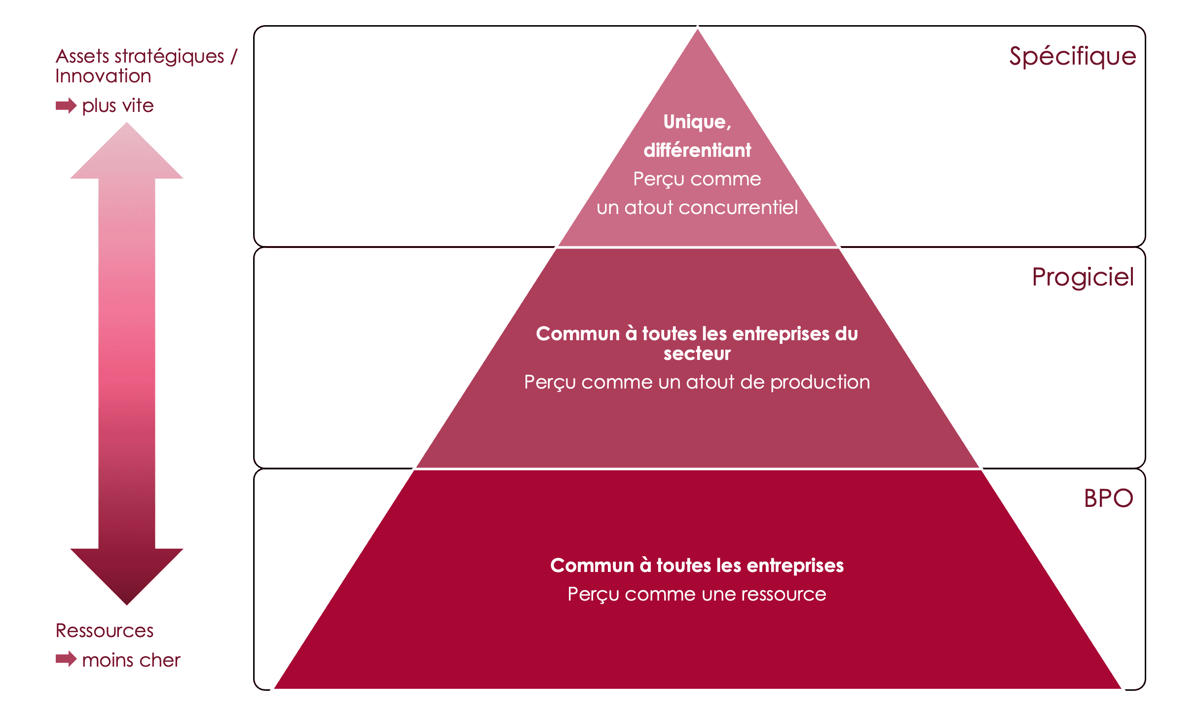 Ces questions permettent d’arbitrer entre les solutions logicielles que vous souhaitez maintenir et faire évoluer (votre cœur de métier), et celles qu’il est plus pertinent de migrer vers des solutions SaaS (services non différenciants ou non stratégiques) voire de déléguer leur gestion à un partenaire (BPO). C’est arbitrer entre les assets à construire et les assets à acheter (Build vs Buy).